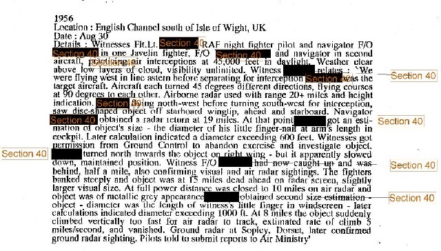 Here we have a sighting of a UFO by 4 fighter pilots in 2 seperate aircraft. With a combination of on board radar and measurements using finger spans against the canopy, later calculations showed the object to be between 600 feet and 1000 feet in diameter.