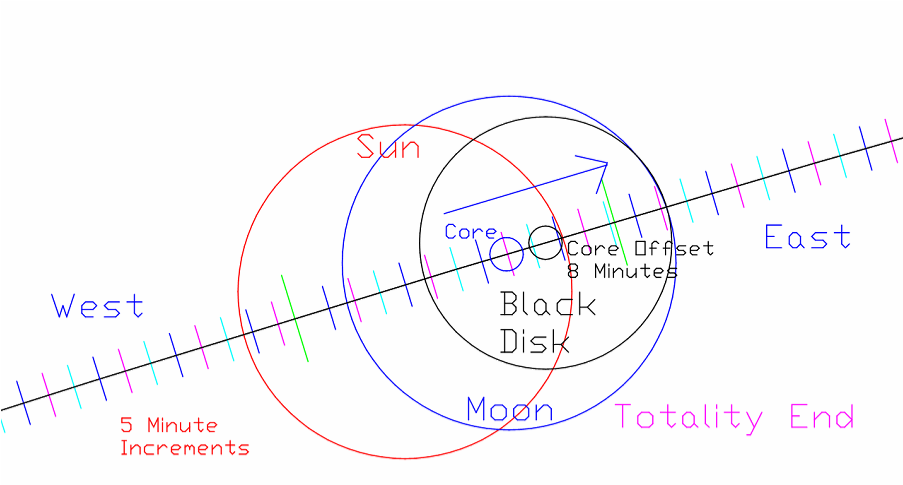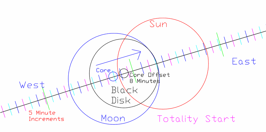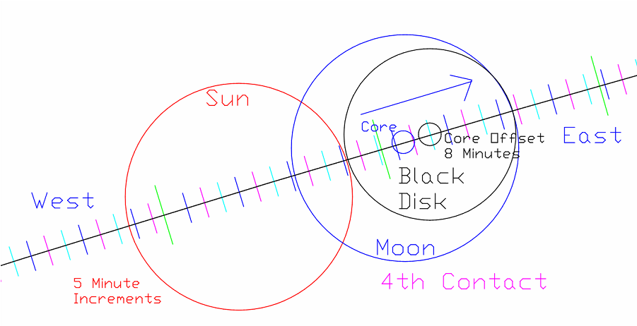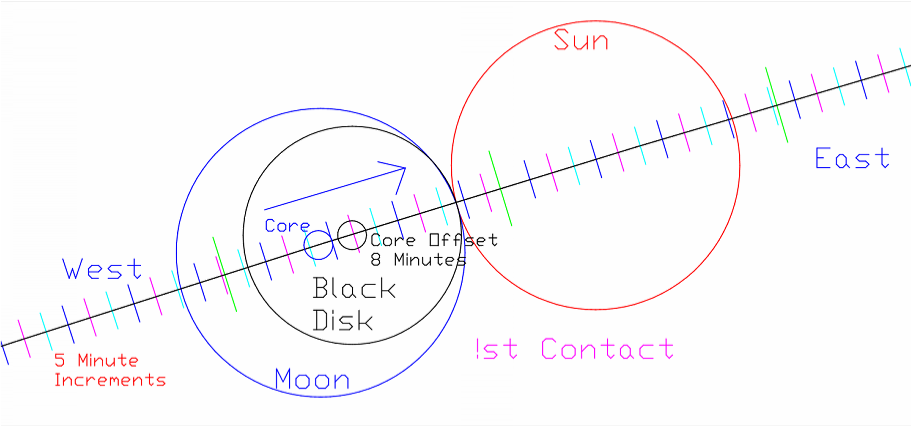 The Eclipse starts exactly on time, according to the position of the Sun. But this light has a lag of about 8 minutes. It is historical. The field from the Sun, which is blocked by the core of the Moon, must be instantaneous or in real time. Therefore the Black Disk in the atmosphere may be offset to, or near, the leading edge of the Moon's position. None of the Moon would be visible during the entire Eclipse, which appears to be an optical illusion created in the electrified area of the ionosphere.