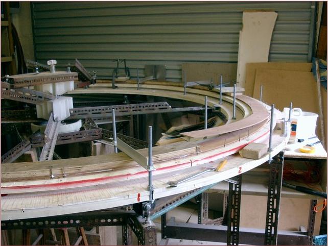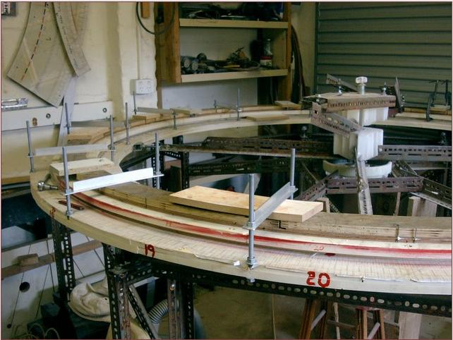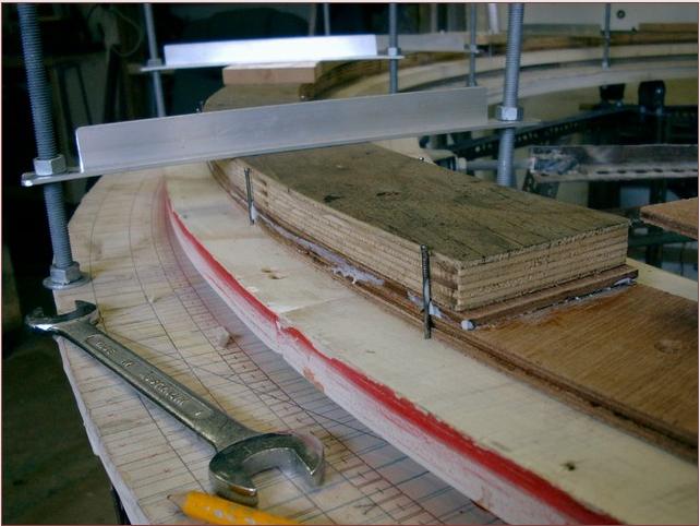 Thick pieces of shaped 20mm formply are on top to help clamp the layers tightly together.