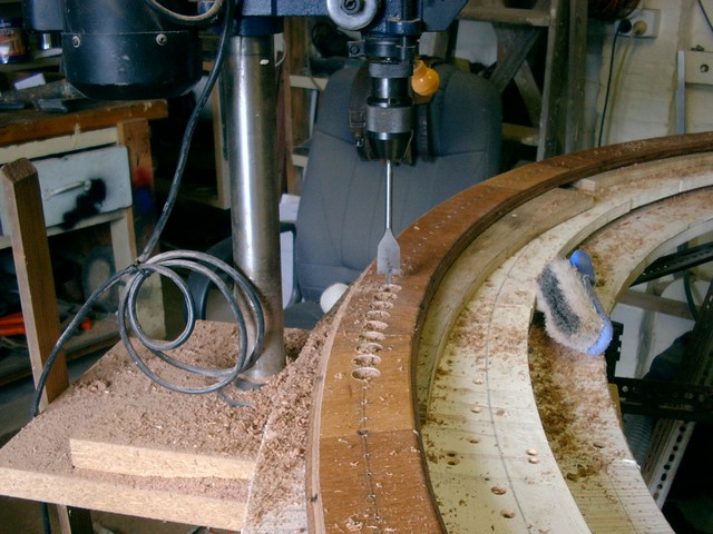 When the magnet hole positions have been marked with a centerpunch, the plywood is lifted up onto packers to prevent damage to the table. The holes are then drilled with a small drill press mounted onto the table supports. First drill all with a small pilot hole, then with the spade bit.