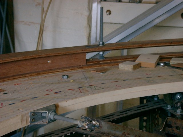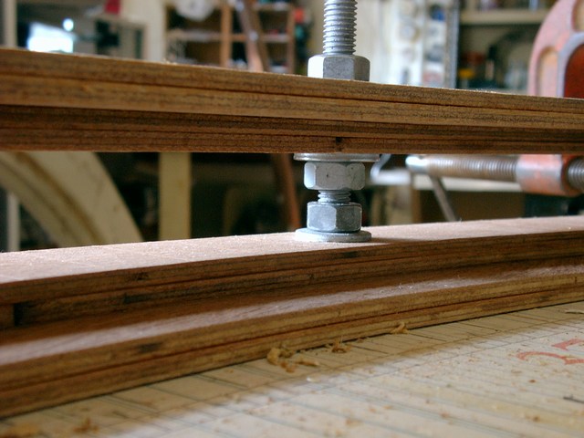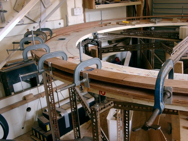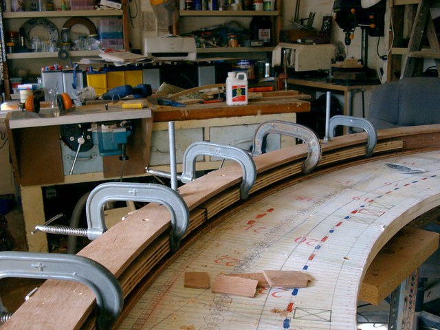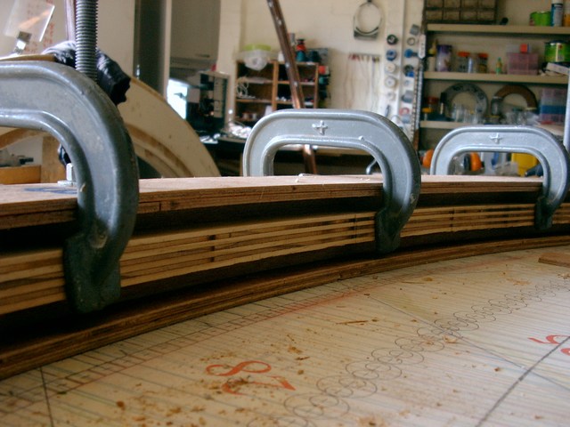 Pieces of plywood are glued and clamped into place against the rebate. Seven layers are used here. Each layer is completed and the next layer staggered. Layers are held in place with heavy plywood cut into curved sections as shown under the clamps.