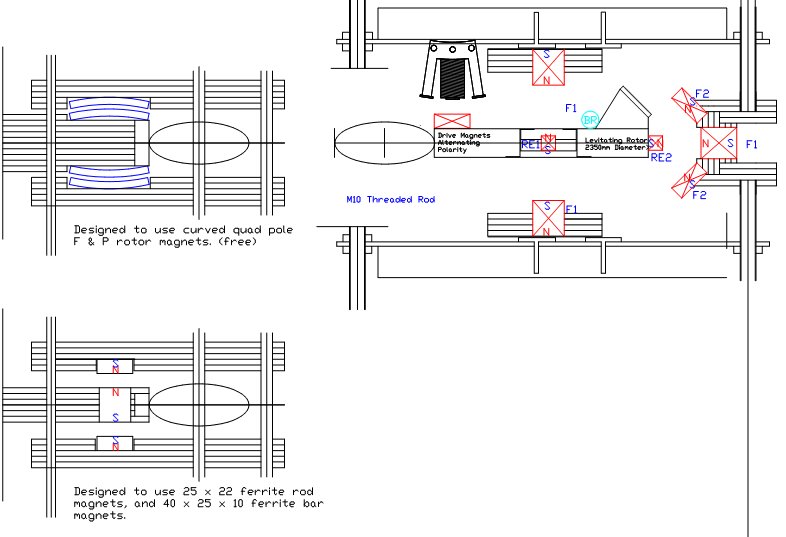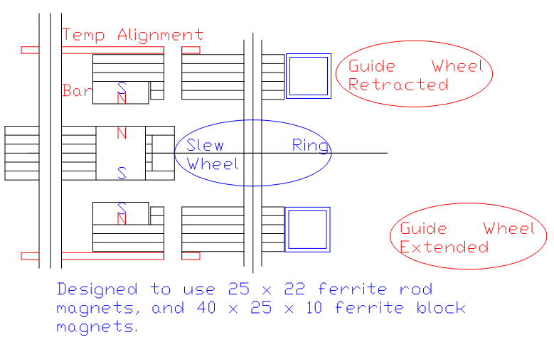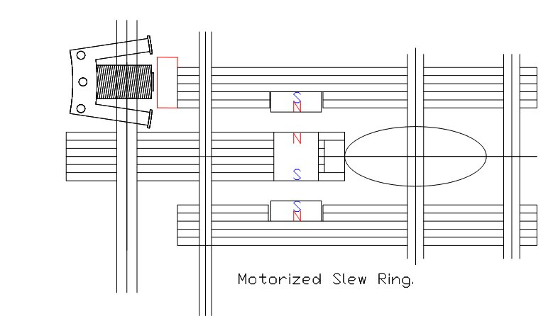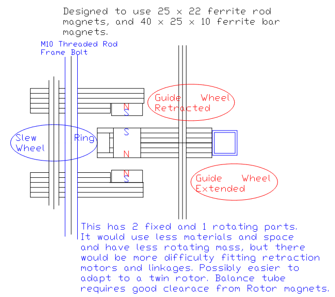 The above design is similar to the Spoke Wheel but does not use much internal space. The Guide Wheels are held firmly against the driven Rotor. When retraction occurs all components are rotating at the same speed. A smoother, more controlled retraction and Rotor levitation should be possible Repelling magnets are used to minimize friction vertically. Fixed Slew Ring Wheels (the same type of rollerblade wheels as used elsewhere) are fitted around an accurately ground circular track.