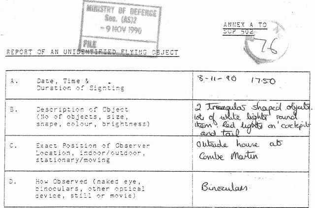 This is a report from the British Ministy of Defence files which were released October 2008. It details binocular views of 2 large triangular machines. Multiple witnesses.