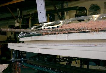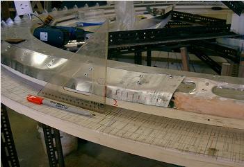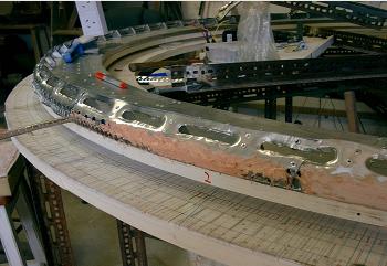 The magnets are held in place with magnetic attraction and epoxy to a steel backing behind an aluminum locating panel which is secured with many Pop rivets. The 25mm steel backing strip is held with 2 countersunk head S/Steel Pop rivets every 50mm directly into the integral flange of the rotor skin. Also many holes are drilled into the rotor for the epoxy to obtain maximum grip. The centrifugal force on these outer magnets is likely to be substantial, but there is also a huge counter balancing effect from the frame opposing magnets, so hopefully the rotor will be reasonably safe.