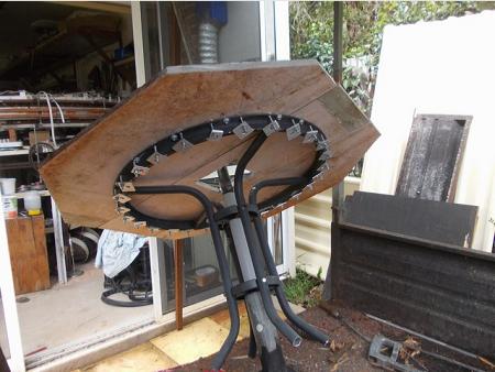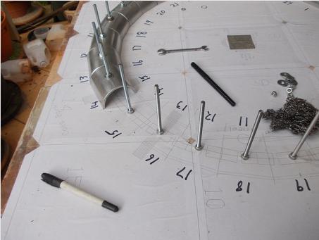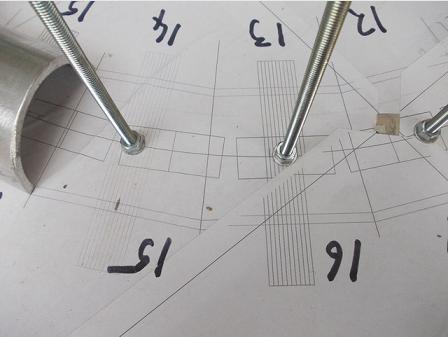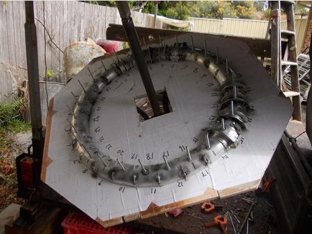 Assembling the lower section upside down. Template is glued to cement fibre sheet