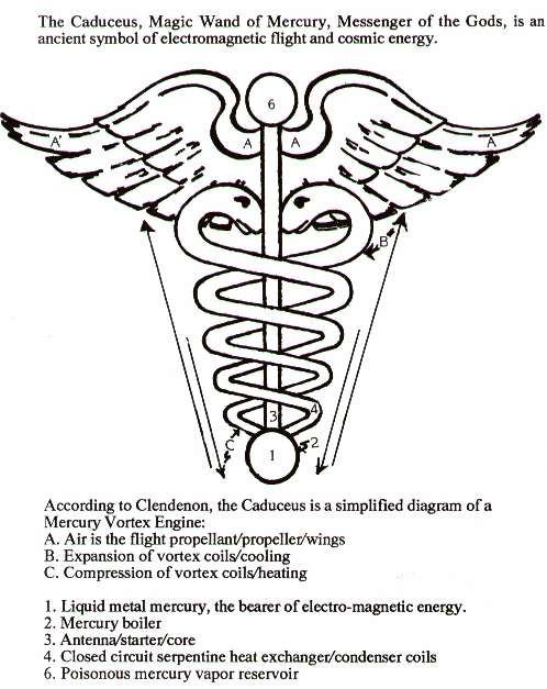 "The crafts primary drive supposedly used the metal Mercury in a closed system that heated the Mercury to a high heat. This vapor was set into oscillation through a set of coils wound in caduceus fashion. (Wrapped around each other like two snakes, the heads pointing at each other.) Please see the picture CADUCEUS (below) from page 248 of the related book, "Vimana Aircraft of Ancient India & Atlantis", by David Hatcher Childress."