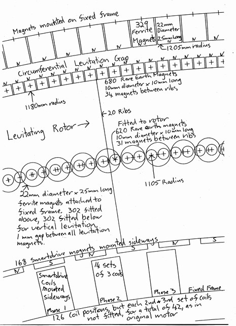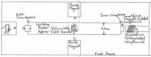 The width across the Rotor/ Levitating Ring is 160mm. The fixed frame is about 300mm wide, leaving a clear space about 1850mm in the center.