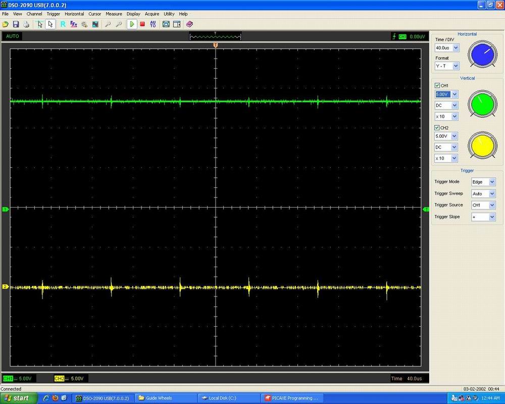 As at July 2014 all guide wheels have been tested for operation with the rotor locked, and all seem to work as expected. However, when the rotor is powered up, all six guide wheels are retracting spontaneously at a rotor speed of only about 1mps. All are starting within a few seconds of each other. With the pic disconnected from the motor, the oscilloscope shows that the pin, B.6, is switching on and staying on at the correct voltage. But with the pic also connected to the debug screen, it shows that the pin to the motor, B.6, is switched off as it should be at that part of the program. It does appear that the program is working correctly, and the PWM spikes from the motor are switching these micros on.