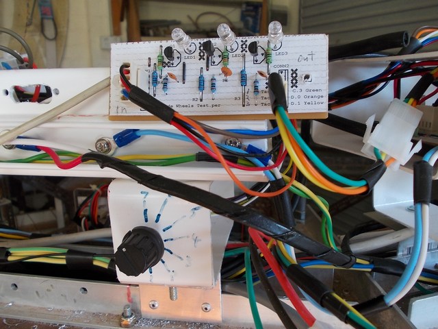This setup is used to bypass the tacho for manual input of the codes required for startup and stopping the rotor. The rotary switch outputs a code, via a micro, to the LEDs and to the guide wheels micro. For convenience the codes are binary. This enables simulated startup with the rotor stationary. It will probably be used initially for running tests. This board can be left in place, the rotary switch disconnected, and the tacho output attached for visual proof of the codes going to the guide wheel coordination micro.