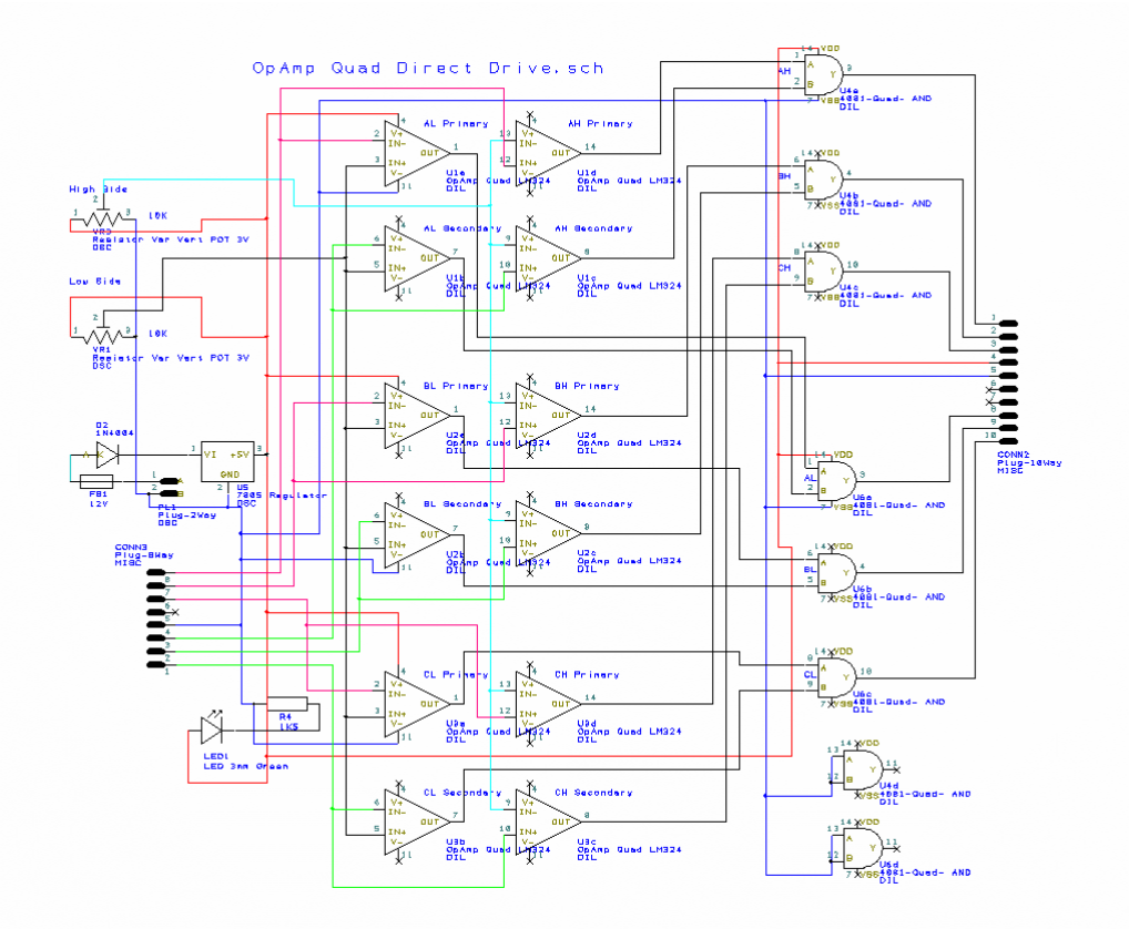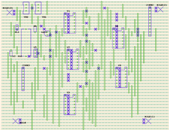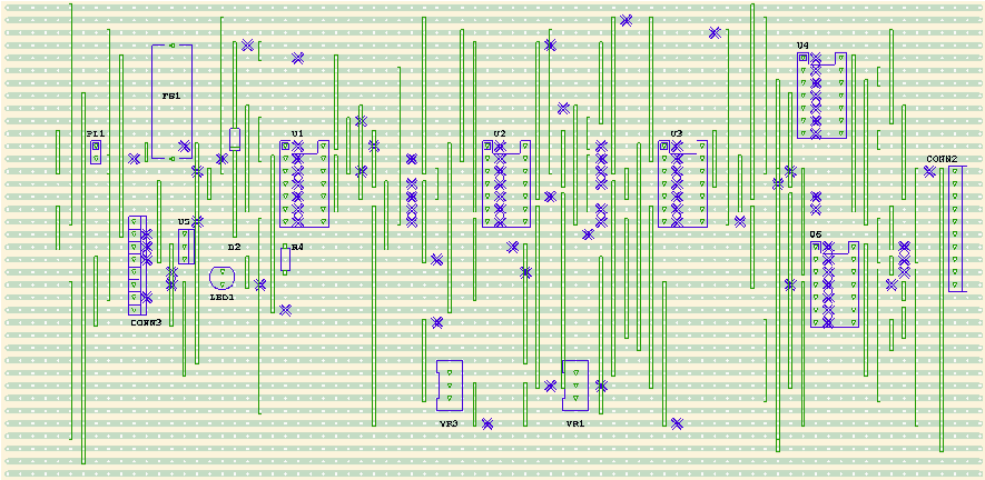 This is the PCB I am using (Oct 2012) for decoding the Hall Sensor analog voltage outputs. The board it is made from was bought from Element14 and is Kelan 147899. It has 41 strips plus 1 undrilled strip each side for a total of 43, and this design uses all 43 strips x 56 ways.