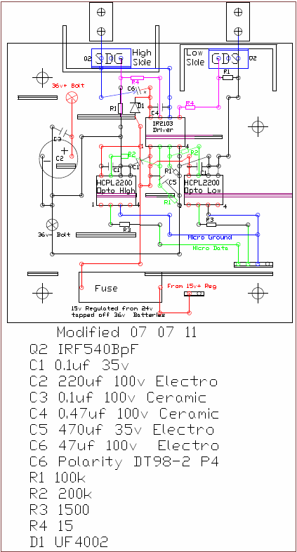 The source leg is bent out, and the discarded drain leg is bent and soldered to the copper track and source leg. An extra diode to supplement the built in mosfet diode can be attached here also. A normal terminal connector enables heavy guage cable to be fitted to the source. A bolt through the heatsink allows heavy guage cable connection to the drain. Each 36v input is fused, so this fuse may need to be bypassed with a diode for regenerative braking under blown fuse conditions.