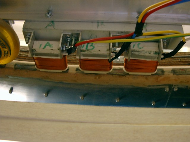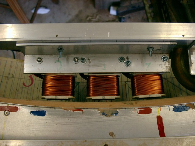 This is the first coil arrangement used to drive the rotor. There were 7 sets like this spaced around the frame. They were able to drive the rotor at about 1 rev per second. The small guide wheels were fixed in place, and the clearance/air gap between coils and magnets was about 3mm.