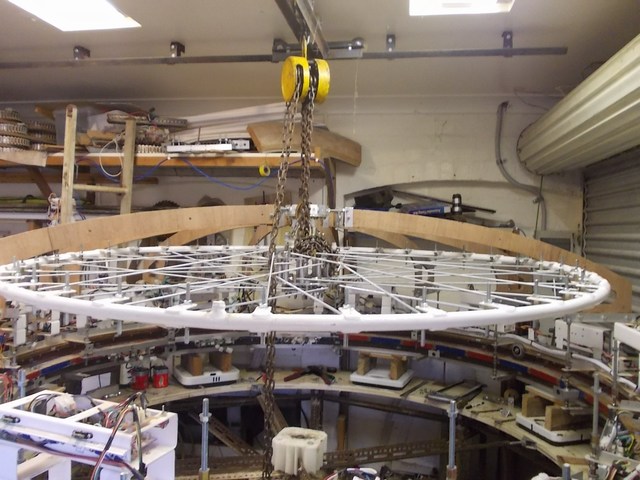 All of the old Guide Wheels have been removed, but some parts, including the 12v motors can be reused. The new Spoke Wheel is fixed to the Rotor at present, and runs smoothly up to a test speed of 4.2 MPS. The Direct Drive electronics used to drive the Rotor appear to be working correctly. A lot of changes are required to programming of some Micros to enable safe testing of the Rotor speed. Two way IR communication is now required between the new Spoke Wheel Micro and existing Guide Wheels Micro.